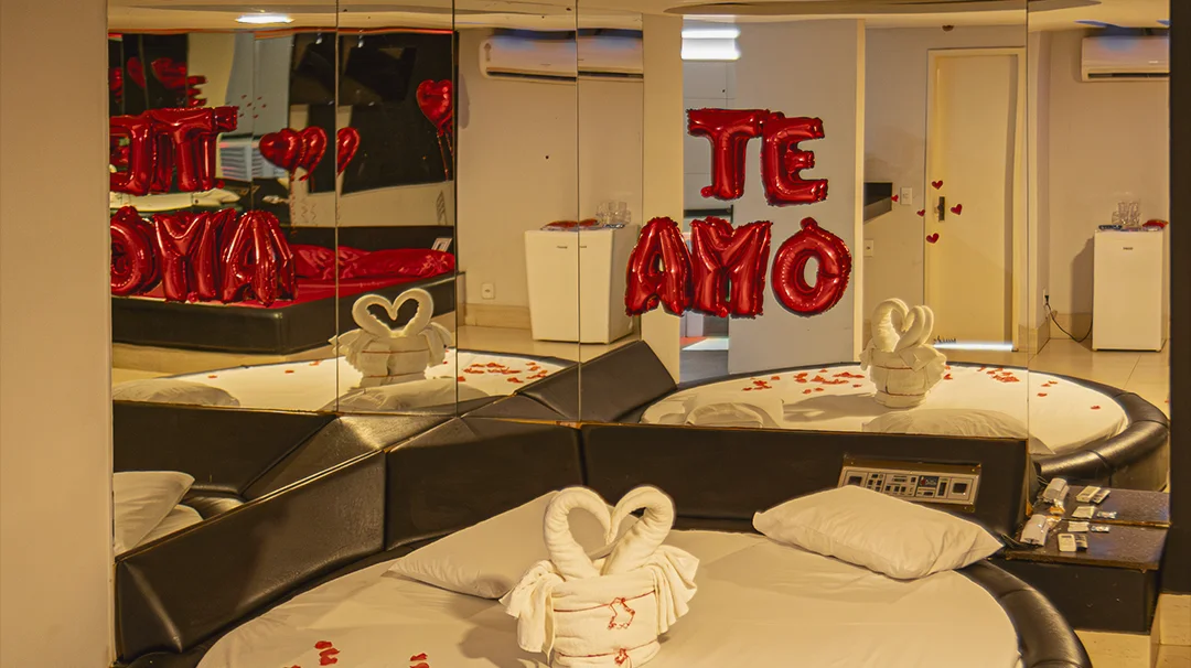 Um cenário romântico para viver momentos que ficam na memória. Cama redonda com lençóis vermelhos, espelho no teto e decoração especial para celebrar o amor. Conforto, privacidade e clima perfeito para surpreender quem você ama.